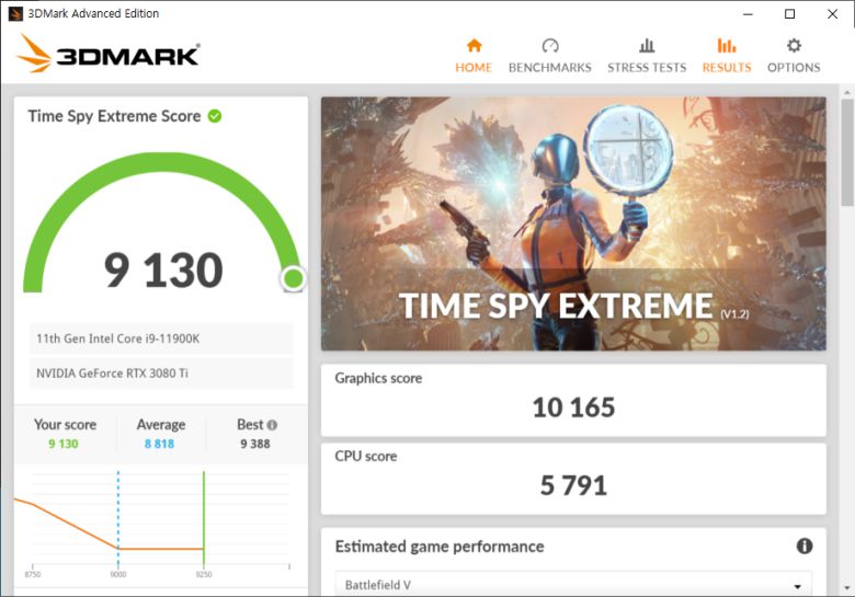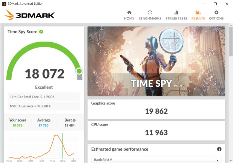 3D마크 타임 스파이 벤치마크 결과이다. 타임 스파이의 그래픽 스코어는 19,862점, 타임 스파이 익스트림의 그래픽 스코어는 10,165점으로 측정되었다. |