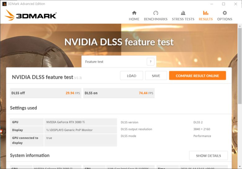 4K UHD 해상도에서 진행한 결과다. DLSS off 상태에서는 약 29.84FPS, DLSS on 퀄리티 모드에서는 52.99FPS, DLSS on 퍼포먼스 모드에서는 74.44FPS를 기록했다. |