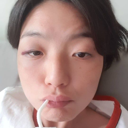 사진 속 안영미는 머리에 붕대를 칭칭 감고 있는 모습. 안영미는 부은 눈을 공개해 팬들의 안타까움을 자아냈다.