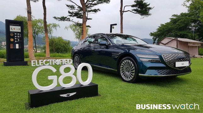 지난 7일 현대자동차가 미디어 대상 시승회를 연 경기도 하남 스타필드에서 'G80 전동화 모델, electrifiid G80(이하 eG80)'를 처음 만났다. 이미 많이 본 G80의 고급스러움은 두말할 필요가 없다. 대면 접촉을 최소화한 시승 절차에 따라 바로 옆에 댄 그랜저가 움츠러들어 보일 정도다. 제네시스는 이제는 벤츠 E클래스, BMW 5시리즈 정도의 수입차엔 꿀리지 않는 '하차감'을 인정받는 수준에 올랐다.