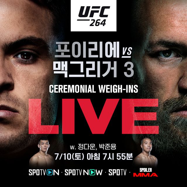 맥그리거와 포이리에는 한국 시간 10일 오전 7시 55분부터 <스포티비 나우(SPOTV NOW)>와 유튜브 채널 <스포일러 MMA(Spoiler MMA)>에서 생중계하는 공개 계체에서 다시 한번 파이팅 포즈를 취한다.