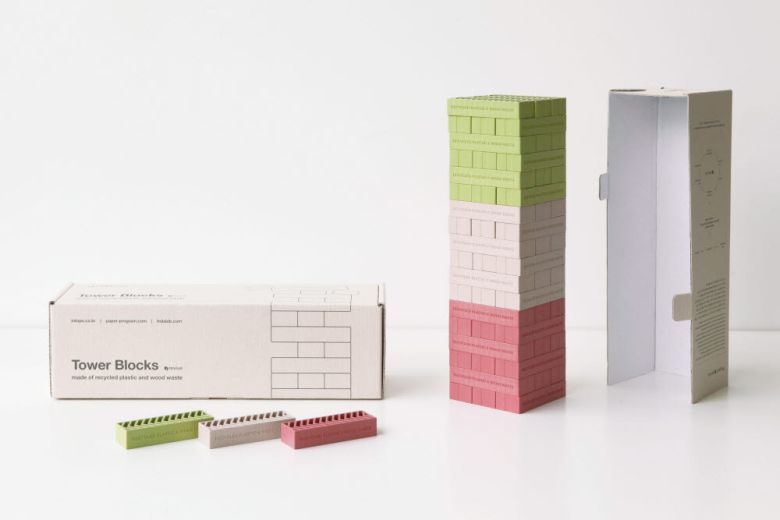 타워 블록은 세트당 일회용 숟가락 135개 수준 폐소재를 활용해 만들었다. 일반 플라스틱 제품 대비 81%의 이산화탄소를 저감할 수 있다.