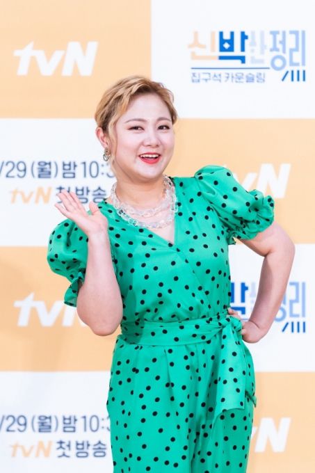 박나래가 '신박한 정리' 제작발표회에서 포즈를 취하고 있다. [사진=tvN]