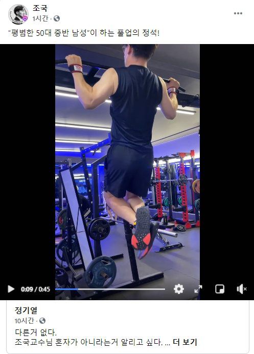 조 전 장관은 16일 ‘평범한 50대 중반 남성이 하는 풀업의 정석’이라는 문구와 함께 다른 사람의 턱걸이 영상을 페이스북에 게시했다. 해당 턱걸이 영상의 원작자는 “다른 거 없다. 조국 교수님 혼자가 아니라는 거 알리고 싶다”고 영상을 찍어 올린 이유를 설명했다.