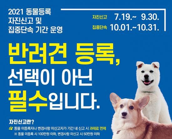 이번 자진신고 기간에 반려동물을 등록하거나 등록된 반려동물의 변경정보를 신고할 경우 동물보호법에 따른 과태료를 면제한다.