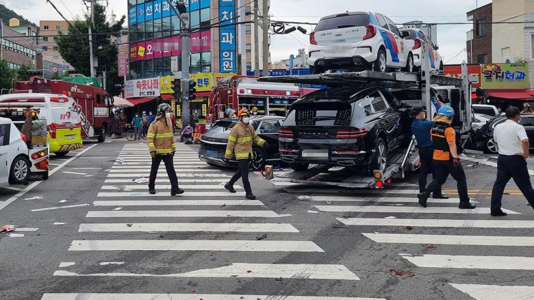 오전 9시쯤 전남 여수시 광무동 한재사거리에서 승용차 6대를 실은 탁송차량이 내리막길에서 속도를 줄이지 못한 채 승용차 10대를 잇달아 충돌하고 횡단보도를 건너던 행인 6명을 덮쳤습니다.