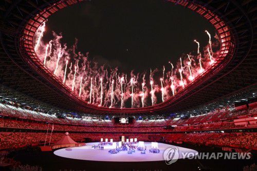 [올림픽] 우여곡절 끝에 도쿄올림픽 개막(도쿄=연합뉴스) 류영석 기자 = 23일 일본 도쿄 신주쿠 국립경기장에서 열린 2020 도쿄올림픽 개막식에서 화려한 불꽃이 올림픽 개막을 알리고 있다. 2021.7.23 ondol@yna.co.kr
