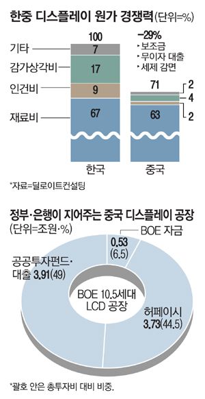 중국 정부는 천문학적 보조금 외에 인프라·세제 혜택으로 기업을 거든다. 우선 토지와 건물, 용수, 전기 등 인프라가 무상 지원된다. 생산성(수율)이 올라가면 격려금이 지급된다. 또 중국은 디스플레이를 포함한 첨단산업에 대해 법인세를 25%에서 13%로 낮춰주며 수입하는 장비와 소재는 무관세 혜택도 제공한다. 이 같은 지원 덕에 중국 업체들의 생산원가는 한국 대비 71%에 불과하다.