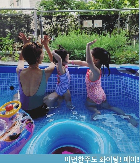 공개한 사진에는 집 발코니에 간이 수영장을 설치해두고 물놀이를 즐기고 있는 이윤지와 두 딸 라니, 소울이의 모습이 담겨있다. 세 모녀는 화이팅 포즈를 취하며 사랑스러움을 자아내고 있다.