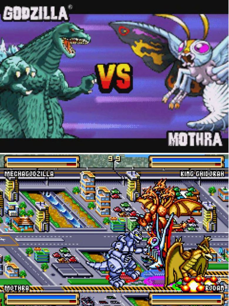 꿀딴지곰 : 닌텐도의 휴대용 게임기 게임보이어드밴스에 등장하는 '고지라 폭렬대난투'도 이번 포스팅에서 꼭 기억해야하는 게임입니다. 괴수들이 한아름 등장하면서 서로 난투를 벌이는 게임이기 때문이죠.