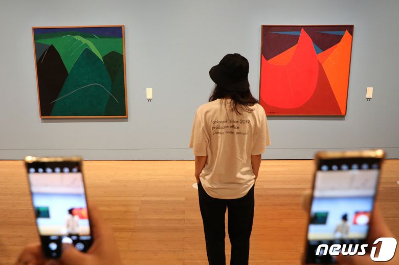 1일 오후 대구미술관을 찾은 관람객들이 이건희 컬렉션 특별전 '웰컴 홈 : 향연饗宴'을 관람하며 'RM ZONE'에서 기념사진을 찍고 있다. 6월 29일 첫 공개된 '이건희 컬렉션 특별전'은 한 달 만에 2만여 명이 찾은 것으로 집계됐다. 최근 BTS(방탄소년단) 멤버 RM(김남준)이 대구미술관을 찾아 유영국 작가의 '산'(1970’s) 시리즈를 감상하는 모습을 BTS 공식 SNS 계정에 올리면서 RM이 작품을 감상했던 장소에서 비슷한 포즈로 인증샷을 남기는 등 인기를 더하고 있다. 2021.8.1/뉴스1 © News1 공정식 기자 |