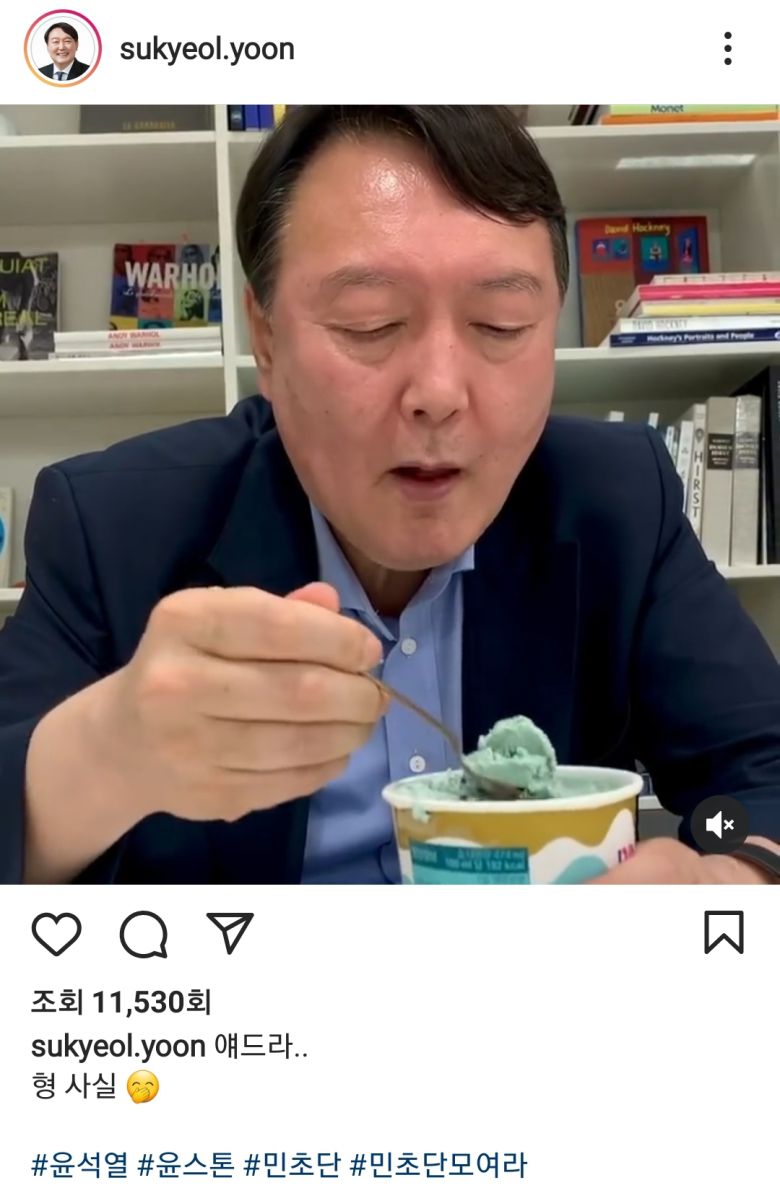 윤석열 전 총장은 2일 자신의 인스타그램에 민트 초코 아이스크림을 먹는 영상을 올리며 얘드라 형 사실···"이라는 글을 남겼다. 글귀 뒤에는 #윤석열 #윤스톤 #민초단 #민초단모여라 등의 해시태그를 덧붙였다.