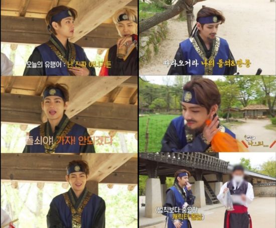수염까지 붙이고 조선시대 무사로 분한 뷔. 그는 "무사 무휼!"을 외치며 용맹스럽게 칼을 휘두르는 모습까지 고품격 사극의 한 장면을 연출했다. 하지만 정작 칼집에 칼을 다시 넣기 힘들어 해 폭소를 자아냈다. 수염이 떨어질까 노심초사하며 조신하게 입을 가리고막고 웃는 모습은 2차 킬링 포인트였다.