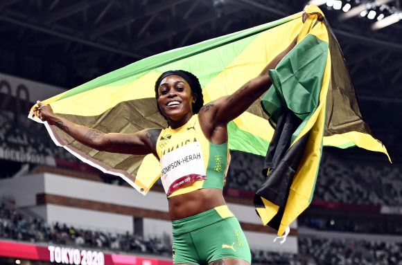 일레인 톰프슨헤라(자메이카)가 3일 2020 도쿄올림픽 육상 여자 200m를 우승하며 두 대회 연속 100m와 200m 우승을 차지하는 ‘더블더블’을 달성한 뒤 국기를 펼쳐 보이며 트랙을 돌고 있다.도쿄 EPA 연합뉴스 |