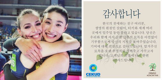 여자배구 대표팀 한국 주장 김연경과 터키 주장 에다 에르뎀(왼쪽사진). 터키 환경단체연대협회가 홈페이지에 올린 감사 편지. [에르뎀 인스타그램, CEKUD]