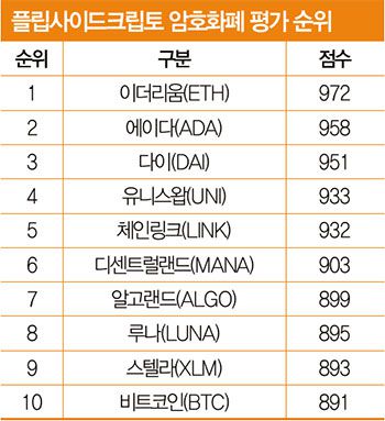 8월 5일 기준 1위 이더리움(972점), 2위는 에이다(ADA, 958점), 3위는 다이(951점), 4위 유니스왑(933점), 5위 체인링크(932점) 등이 상위권에 포진해 있다. 비트코인(891점)은 10위에 랭크돼 있다.