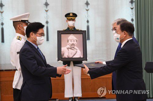 (서울=연합뉴스) 최재구 기자 = 문재인 대통령이 17일 청와대에서 열린 고 홍범도 장군 훈장 추서식에서 홍범도장군기념사업회 우원식 이사장에게 건국훈장 대한민국장을 추서하고 있다. 2021.8.17 jjaeck9@yna.co.kr