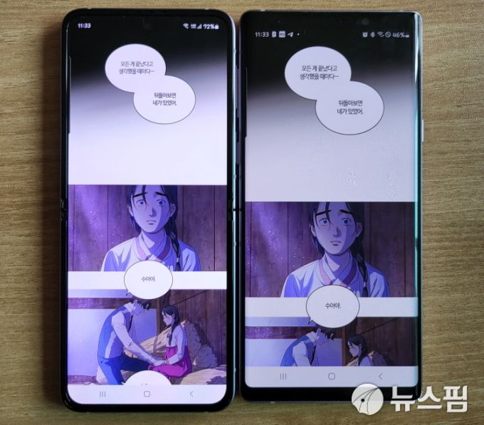 [서울=뉴스핌] 나은경 기자 = 갤럭시Z플립3(왼쪽)과 갤럭시노트9(오른쪽)로 웹툰을 보는 모습. 세로로 긴 갤럭시Z플립에서 훨씬 많은 양의 컷을 볼 수 있다. 2021.08.23 nanana@newspim.com
