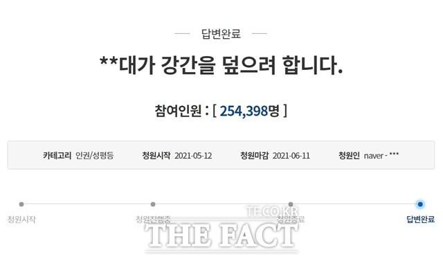 해당 청원은 25만명의 동의를 얻어 청와대의 답변까지 받았다. 당시 청와대 국민소통수석실 디지털소통센터는 "앞으로 대학 내 성희롱·성폭력을 근정하고 인권과 양성평등 문화를 확산하기 위해 적극적으로 노력하겠다"고 답했다.