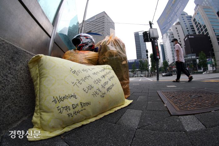 “도 넘은 악플 멈춰주세요” 29일 서울 강남구 선릉역 교차로 인근 인도 한쪽에 지난 26일 화물차에 치여 숨진 오토바이 배달노동자를 추모하는 글귀와 용품들이 놓여 있다. 박민규 선임기자