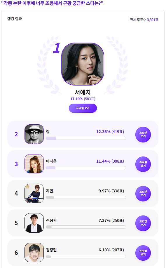 총 투표수 3391표 중 583(17.19%)표로 1위에 오른 서예지는 지난 4월 김정현 가스라이팅 논란으로 구설에 오른 후 연예계 활동을 중단했다. 활동을 중단한 지 두 달 만에 자신의 근황을 공개했던 서예지는 이후 아무런 활동이 없어 팬들의 궁금증을 자아내고 있다.