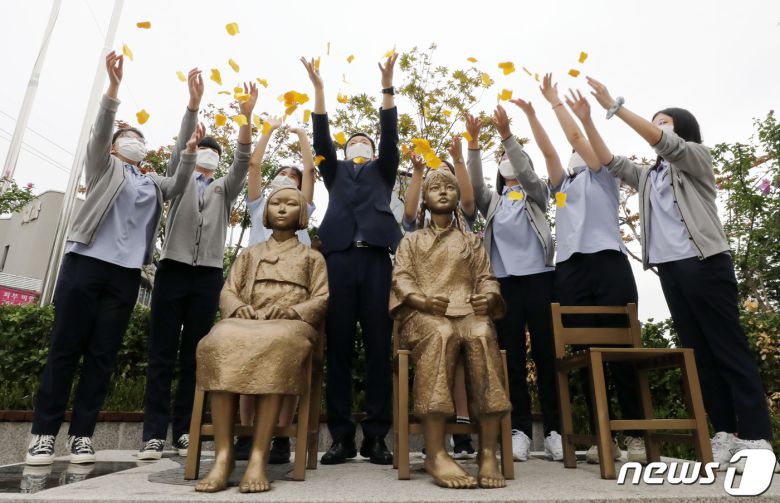 (서울=뉴스1) 박세연 기자 = 이승로 성북구청장과 계성고등학교 학생들이 1일 오전 서울 성북구 분수마루 평화의 소녀상에서 베를린 평화의소녀상 영구 존치 요청 메시지 전달식을 갖고 소녀상에 나비를 날리고 있다.