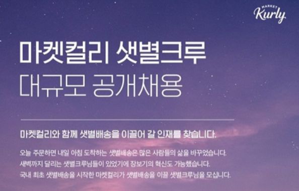 1일 관련 업계에 따르면 마켓컬리는 2015년 출범한 뒤 처음으로 배송직원 공개채용에 나섰다. 오는 9월10일까지 샛별배송 차량 운전·배송 업무를 수행할 '샛별크루'를 뽑는다. 세자릿수 인원을 공개채용한다. 그동안 마켓컬리가 정규직 샛별크루를 일부 운용해오긴 했지만, 대규모로 채용하는 건 처음이다.