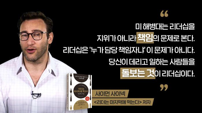 "미 해병대원들은 최하급자가 가장 먼저, 최상급자가 가장 나중에 배식을 받는다. 해병대원이라면 누구나 그냥 그렇게 한다. 그뿐이다. 해병대에서는 으레 리더가 제일 마지막에 먹는 것으로 되어 있다. 자신의 필요보다 기꺼이 타인의 필요를 우선할 수 있는 마음가짐이야말로 리더십에 따르는 진정한 의무이기 때문이다."