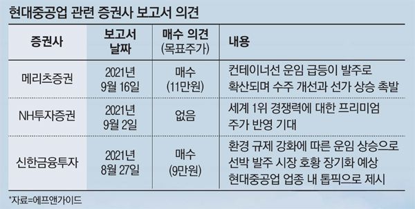 김현 메리츠증권 애널리스트는 "컨테이너선 운임 급등이 발주로 확산돼 수주가 개선되고 있고, 신조선가지수도 2010년 이후 최고치"라며 "조선 연료 변화 국면을 세계 1위 사업자 현대중공업이 주도하게 될 것"이라고 분석했다. 최진명 NH투자증권 연구원도 "경쟁사 대비 우수한 경쟁력을 갖추고 있는데도 비교적 저렴한 가격으로 증시에 입성했다"고 평가했다.