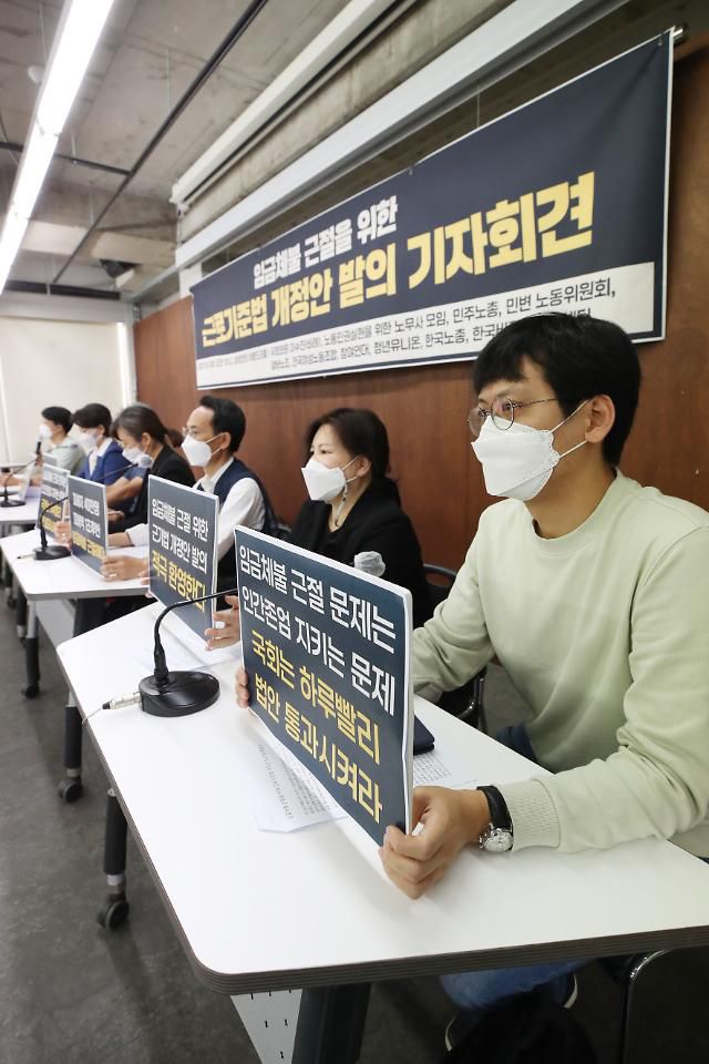 임금체불 근절을 위한 근로기준법 개정안 발의 기자회견     (서울=연합뉴스) 강민지 기자 = 6일 오전 서울 종로구 참여연대에서 열린 임금체불 근절을 위한 근로기준법 개정안 발의 기자회견에서 참석자들이 손팻말을 들고 있다. 2021.9.6     mjkang@yna.co.kr/2021-09-06 10:45:46/ <저작권자 ⓒ 1980-2021 ㈜연합뉴스. 무단 전재 재배포 금지.>