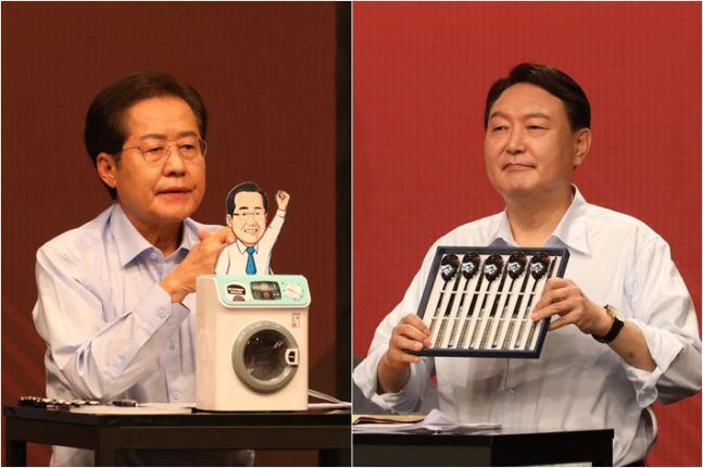 국민의힘 대선 경선 후보 홍준표 의원(왼쪽), 윤석열 전 검찰총장이 26일 서울 마포구 상암동 채널A 스튜디오에서 열린 국민의힘 제20대 대통령 경선후보 3차 방송토론회에 참석한 모습. 연합뉴스 |