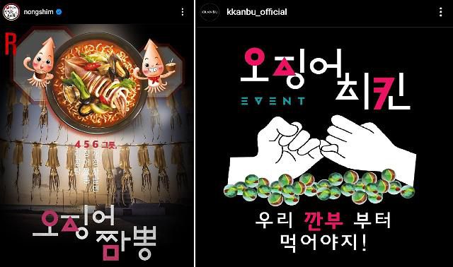 오징어게임에 직접 등장하지는 않지만 연관 마케팅에 나선 기업도 있다. 농심은 오징어게임 포스터를 패러디해 비슷한 디자인으로 라면 ‘오징어짬뽕’ 홍보에 나섰다. 포스터에는 주인공의 번호인 456번을 이용해 ‘4(사리곰탕), 5(오징어짬뽕), 6(육개장사발면) 그릇’이라는 문구가 담겨 눈길을 끌었다. 치킨 프랜차이즈 깐부치킨도 인스타그램을 통해 ‘우리 깐부부터 먹어야지’라는 문구를 앞세워 이벤트를 열었다. ‘깐부’는 드라마 속에 등장하는 단어로, 한편인 동료를 말한다.