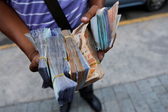 지난달 5일 베네수엘라 수도 카라카스에서 버스 보조기사가 한 뭉치에 0.01달러에서 0.25달러 가치를 지닌 여러가지 볼리바르 지폐 뭉치를 들 고 있다.로이터뉴스1