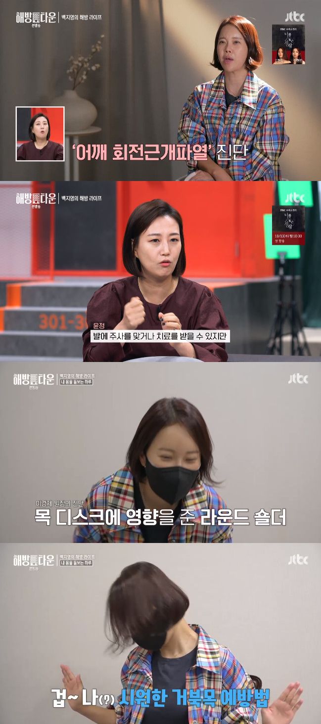 백지영은 어깨 회전근개파열 뿐만 아니라 목 디스크도 있다며 자가치료법을 알기 위해 한의원을 방문했다. 이경제 한의사는 백지영의 건강 고민을 물었고 백지영은 "아프기 시작한 건 한 5~6년 됐다"라고 밝혔다. 이에 이경제 한의사는 백지영이 굽은 어깨를 가지고 있다며 "이때부터 목 디스크가 시작됐다고 본다"라고 설명했다.