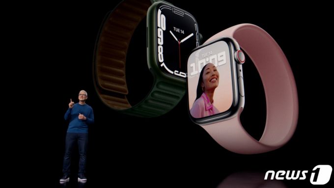 (로이터=뉴스1) 김진환 기자 = 팀 쿡 애플 CEO가 14일(현지시간) 캘리포니아 쿠퍼티노 애플파크에서 스페셜 애플 이벤트를 통해 애플워치 7를 공개하고 있다. 애플은 이날 온라인 행사를 통해 Δ아이폰13 미니 Δ아이폰13 Δ아이폰13 프로 Δ아이폰13 프로 맥스 등 총 4가지로 구성된 아이폰13 시리즈와 9세대 아이패드, 6세대 아이패드 미니, 애플워치 시리즈7 등을 선보였다. 가격은 아이폰13 799달러(약 94만원), 아이폰13 미니 699달러, 아이폰13 프로 999달러, 아이폰 13 프로 맥스 1099달러, 9세대 아이패드 329달러, 6세대 아이패드 미니 499달러, 애플워치 시리즈7 399달러 등이다. (C) 로이터=뉴스1