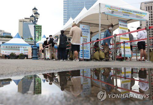 (서울=연합뉴스) 이지은 기자 = 5일 오전 서울역광장에 마련된 신종 코로나바이러스 감염증(코로나19) 임시 선별검사소에서 시민들이 검사를 받기 기다리고 있다. 2021.10.5 jieunlee@yna.co.kr