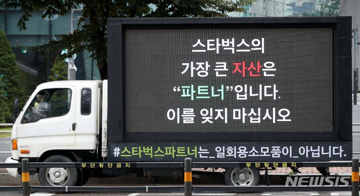 트럭 전광판에는 '스타벅스 파트너 일동'으로 "스타벅스파트너는 일회용 소모품이 아닙니다", "스타벅스코리아는 창립 22년 만에 처음으로 목소리내는 파트너들을 더이상 묵인하지 마십시오" 등의 문구가 기재됐다.