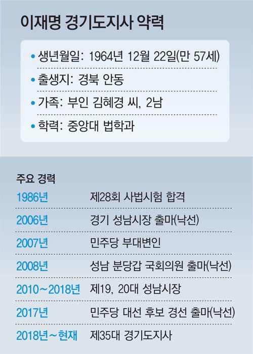 이후 열린우리당(현 민주당)에 입당해 2006년 성남시장, 2008년 성남 분당갑 국회의원 선거에 도전했지만 패했고 2010년 성남시장에 재도전해 당선됐다. 2017년엔 민주당 후보 경선에 도전해 문재인, 안희정 후보에 밀려 3위에 그쳤지만 ‘전국구’로 이름을 알리는 계기가 됐다. 이 과정에서 공직선거법 위반 혐의로 지사직 상실 및 피선거권 박탈 위기에 몰렸던 그는 지난해 7월 대법원의 무죄 취지 파기환송 판결 덕에 정치적으로 기사회생해 대선 재도전에 나섰다.