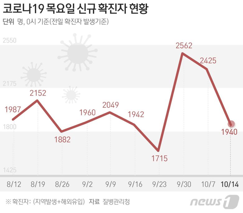 0시 기준 신규 확진자 추이는 10월 1일부터 10월 14일까지 최근 2주간 '2484→2247→2085→1670→1574→2027→2425→2173→1953→1594→1297→1347→1583→1940명'으로 나타났다.