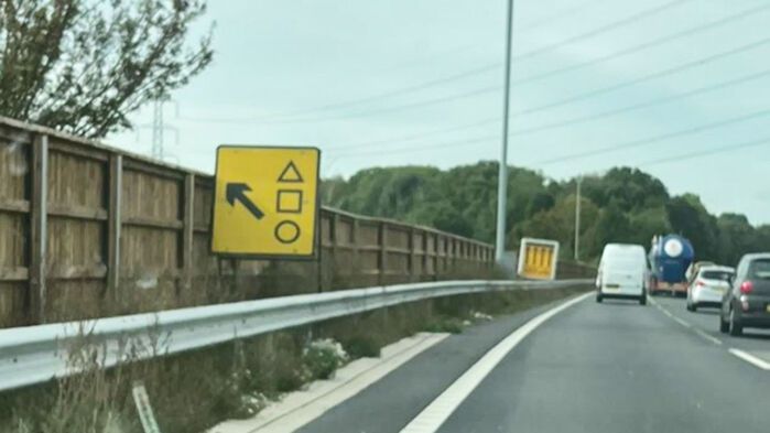 영국 고속도로 한 곳에 설치된 표지판 문양이 드라마 속 주인공들에게 전달된 게임 초대장 문양과 비슷합니다.