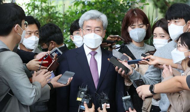 고승범 금융위원회 위원장이 14일 오전 서울 여의도 금융투자협회에서 열린 투자자 교육 플랫폼 ‘알투플러스' 오픈 기념회에 참석한 뒤 취재진 질문에 답하고 있다. 연합뉴스 |