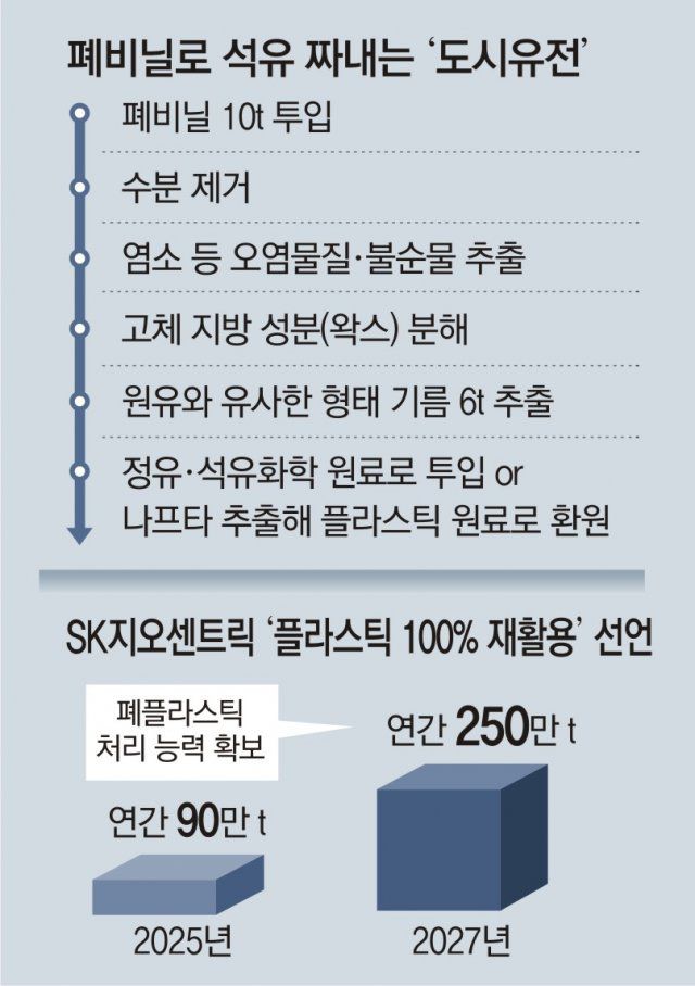 SK이노베이션은 ‘도시 유전’에서 만들어진 폐플라스틱 열분해유를 국내 정유·석유화학 업계 최초로 실제 정유 공정에 지난달 시범 투입했다. 폐비닐에서 나온 기름을 원유와 섞어 다시 석유 제품으로 환원하는 데 성공했다. 연내 200t 규모를 시작으로 점차 투입량을 늘려나갈 계획이다. 해외에선 글로벌 화학 기업 바스프, 엑손모빌 등이 소량을 자사 공정에 투입한 바 있다.