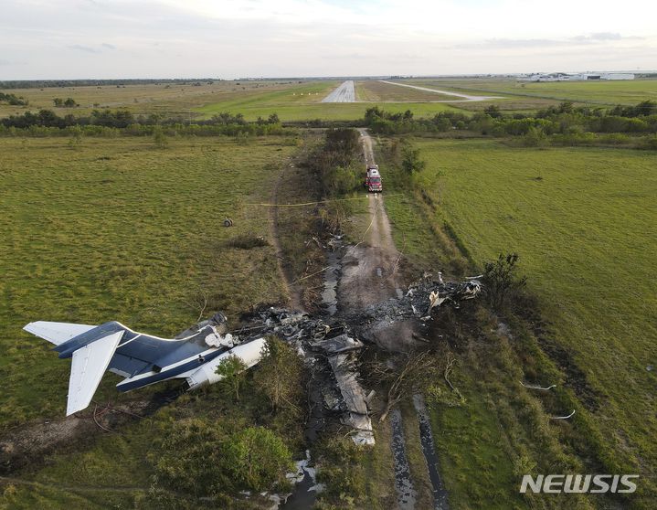 [휴스턴=AP/뉴시스] 19일(현지시간) 미 텍사스주 휴스턴의 이그제큐티브 공항에서 이륙에 실패한 항공기 한 대가 울타리를 들이받고 활주로 약 150m를 이동한 후 불이 나는 사고가 발생해 현장에 사고기 잔해가 남아있다. 소방당국은 구조대원들이 도착했을 때 승객 20여 명 전원이 이미 무사히 비행기에서 빠져나와 인명 피해는 없었다고 밝혔다. 이 항공기는 미프로야구 아메리칸리그 챔피언십 시리즈 경기를 위해 보스턴으로 향했던 것으로 알려졌다. 2021.10.20.