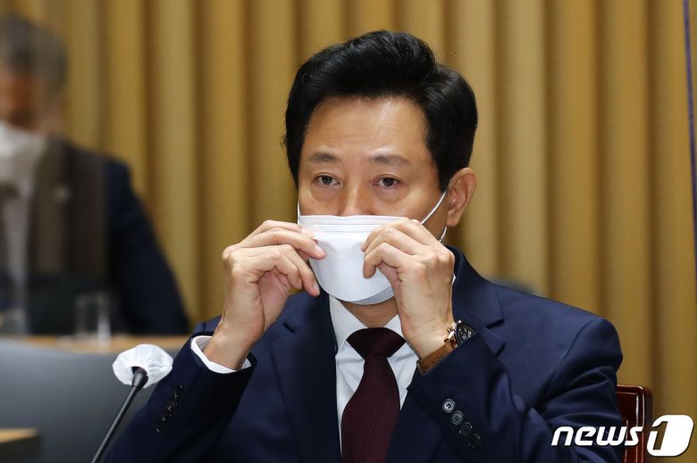 (서울=뉴스1) 국회사진취재단 = 오세훈 서울시장이 20일 서울시청에서 열린 국회 국토교통위원회의 서울시에 대한 국정감사에서 마스크를 고쳐쓰고 있다. 2021.10.20/뉴스1