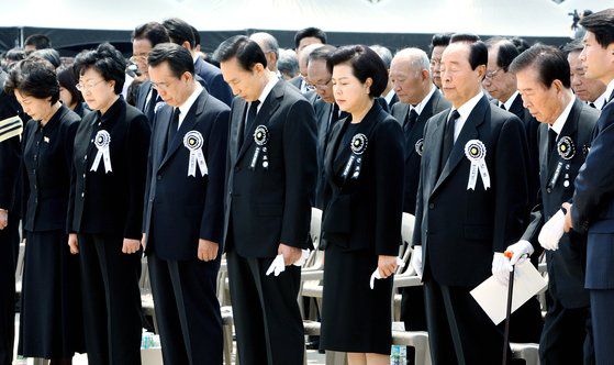 2009년 5월 29일 이명박 대통령 부부, 김영삼 김대중 전 대통령, 권양숙 여사 등이 서울 경복궁 앞 뜰에서 열린 노무현 전 대통령 국민장 영결식에서 묵념을 하고 있다. 중앙포토 |