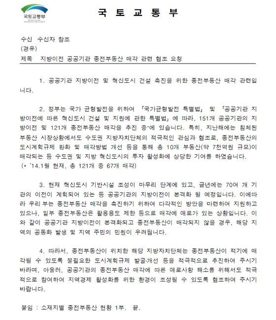백현동 부지는 녹지지역이라 개발이 제한되다 보니 8차례 공개 입찰이 유찰됐다. 이에 따라 국토부는 2013년 협조요청을 시작으로 2014년 1월, 5월, 10월에 공문을 잇달아 발송했다. 1월 발송된 첫 번째 공문은 국토부가 28곳의 지자체장에게 똑같이 발송했다. “종전부동산이 적기에 매각될 수 있도록 불필요한 도시계획 규제 발굴·개선 등을 적극적으로 추진해 달라”는 요청이 담겼다.