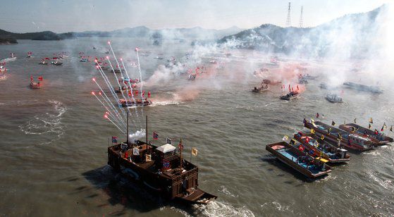 2014년 10월 11일 명량대첩을 재연한 '2014 명량대첩축제'. 맨 앞에 보이는 배가 판옥선이다. [연합뉴스] |