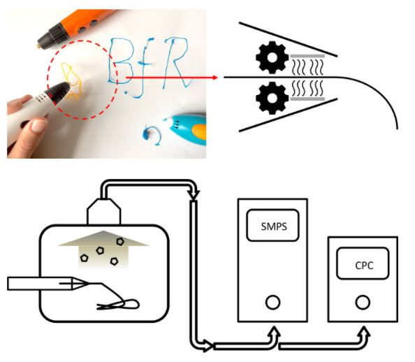 3D 프린팅 펜 그림과 3D 프린팅 펜의 회로도 구조(상단), 온라인 에어로졸 측정을 위한 실험용 설정(하단) / JoVE 저널 '3D 프린팅 펜의 입자 배출 평가(2020년)' |
