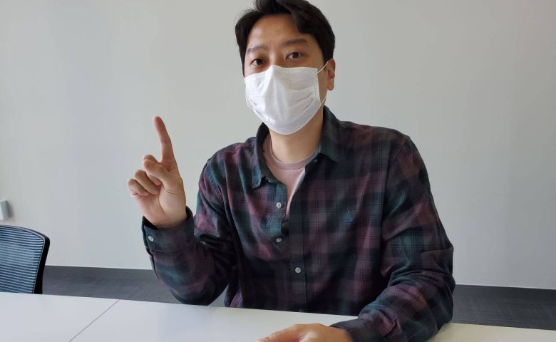 인터뷰 마지막에 '지구를 지켜라!'에 대해 설명 중인 조 대표 |