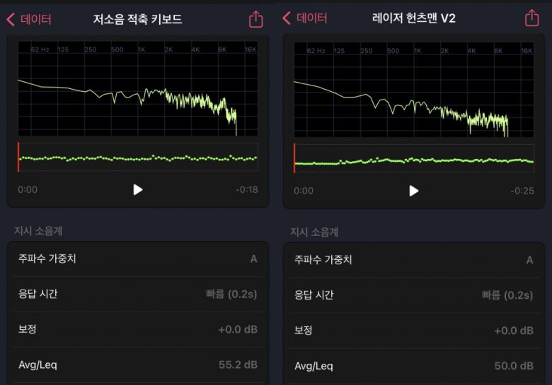 체리 MX 저소음 적축이 탑재된 게이밍 키보드(C모사 제품)와 비교할 때는 어떨까? 같은 환경에서 타건해본 결과 체리 MX 저소음 적축 게이밍 키보드는 평균 55.2dB을 기록했다. 반면, 레이저 헌츠맨 V2는 5.2dB이나 낮은 평균 50dB을 기록했다.
